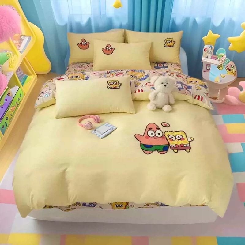 スポンジボブの布団カバーシーツと枕カバーの3点セットです!かわいらしいデザインで、お部屋を明るく楽しい雰囲気に仕上げてくれるアイテムです。