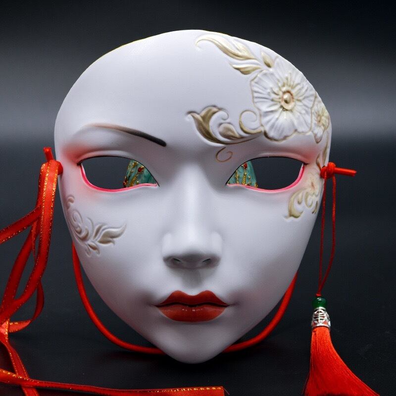 華やかな赤い花模様と繊細な装飾が目を引く、古風な雰囲気ただようフルフェイスマスクです。