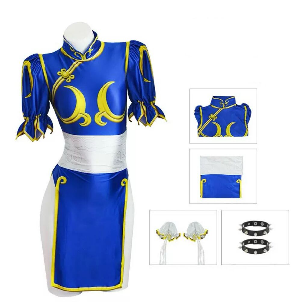 人気格闘ゲーム「ストリートファイター」の春麗をモチーフにしたコスチュームセットです。鮮やかなブルーに黄色の装飾が映えるデザインで、イベントや撮影、ハロウィンなどにもぴったりです。