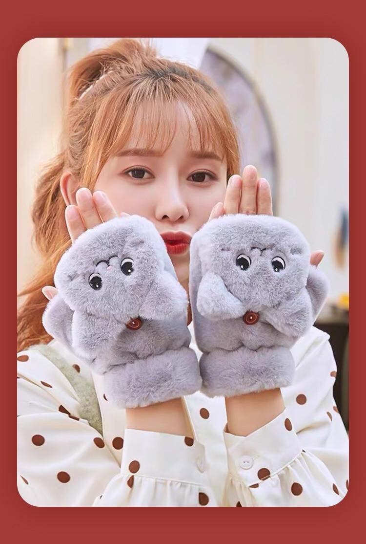 ふわふわの白猫デザインが可愛い、露指タイプのミトン手袋です。